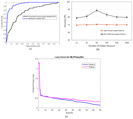 Performance comparison of the model between band power-based and autoregressive (AR)-based features for subject 4: (a) receiver operating characteristic (ROC) curves for the band power-based and AR-based classifiers; (b) system accuracy with respect to the number of hidden neurons in the artificial neural network (ANN) model; (c) cross-entropy loss during training and testing of the AR model-based classifier.