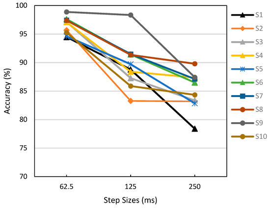 Figure 8 shows the effect of the step size on the system accuracy. We estimated the computational time of the system for a single cycle of feed-forward computation (prediction) to be approximately 48 ms. Hence, three different step sizes including 62.5 ms (8 samples), 125 ms (16 samples), and 250 ms (32 samples) were investigated to obtain the best system performance with regard to the detection accuracy and detectable time. For all subjects, the system exhibited the best accuracy (approximately 95%) with a short step size of 62.5 ms. A significant accuracy reduction occurred when the step size increased for most subjects, with the exception of subject 9. There was no significant difference in the accuracy between the step sizes of 125 and 250 ms, except for subjects 1 and 9. Thus, the step size of 62.5 ms was selected for the system.