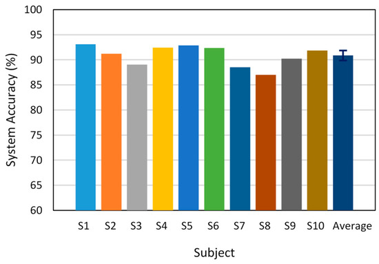 The model evaluation via online testing during 10 minutes of driving is shown in Figure 10. These results were obtained with the best configuration of the model based on the offline evaluation: an AR feature extractor with order 10, 50 neurons in the hidden layer, a 600-ms pre-braking period, and a step size of 62.5 ms. Accordingly, the system exhibited an accuracy above 90% for subjects 1, 2, 4, 5, 6, 9, and 10. The lowest accuracy occurred in the case of subject 8 (~87%). The average accuracy for the 10 subjects was 90.8%.