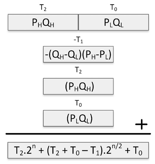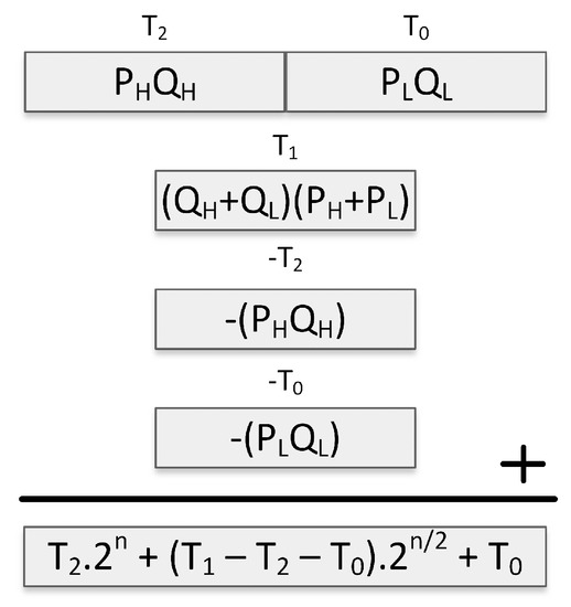 Karatsuba-Ofman method is a technique to accelerate integer multiplication [44]. It achieves multiplication of two integers by performing multiplications and additions/subtractions of smaller integers. Figure 1 shows the Karatsuba-Ofman method applied for the multiplication of the two integers P and Q. In the method, each operand is first fragmented into two halves containing the higher and lower ordered bits. The higher and lower ordered halves of P and Q are represented as , , and . Three partial products, i.e., , and , are computed by adding/multiplying the operand halves. Finally, with some additions and subtractions on the partial products, the result is obtained, as shown in Figure 1.
