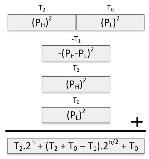 Since the algorithm adds higher and lower ordered halves of the operands and multiplies them to compute , the size of this multiplication may alter depending on the carry bits generated by the additions. For this reason, integer multiplication may cost slightly more in this step. Subtractive Karatsuba-Ofman, which is an improved version of Karatsuba-Ofman, was proposed to mitigate this problem [45,46]. The subtractive Karatsuba-Ofman technique, described in Figure 2, eliminates the carry bits that are generated by the addition operations.