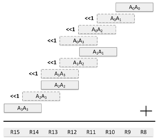 Figure 4 gives the order of word multiplications in our operand scanning implementation on the 16-bit MSP430 microcontroller. The 64-bit operands A and B are represented in four words as [] and [], respectively. The method computes word multiplications from top to down as described in Figure 4. By doing this, the words , , and are written to the hardware multiplier register only once. As seen in Figure 4, is the first operand for the first four multiplications and it is written to the multiplier register only once. Whereas, four write operations are performed to write the words of the second operand, i.e., , , and , to the second input register of the hardware multiplier. Similarly, register write operations are saved also for the multiplications with , and in following 12 word multiplications. The word multiplications where a register write operation is saved are indicated in Figure 4 with rectangles surrounded by a dashed border line. The 128-bit final result is stored in the registers down to .