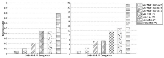 Note that Qiu et al. also use the sliding window method with the same 4-bit window size. They do not mention any other acceleration methods they use for their RSA decryption implementation. Hence, it is unclear how they obtained the timing result of s for their RSA decryption implementation while the theoretical estimate is 20 s. The comparisons of the timing values for our implementations of the underlying 512-bit modular multiplication/squaring operations and the implementations by Qiu et al. [38], on the same MSP430F1611 microcontroller, are given in Figure 8 and Table 4.