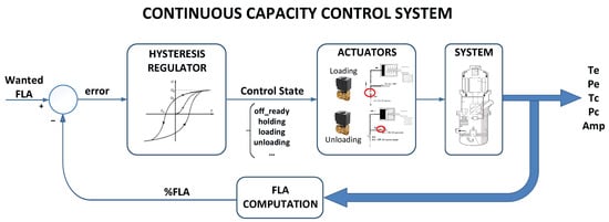 In a continuous capacity control system, the full load amperage (FLA) [26], i.e., the amperes which the compressor consumes at full load (nominal displacement of the refrigeration gas), usually play an important role. This variable depends mainly on the temperatures and pressures of the refrigeration gas in the discharge and suction lines. The higher the temperatures and pressures are, the higher the compressor work is. For example, outdoor temperature provokes an increase in the condensing temperatures and pressures and, as a consequence, of the compressor consumption. Therefore, the control board continuously computes the FLA (from the difference between the current and design measurements of the temperature and pressure sensors), which is different for each situation.