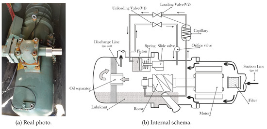 Heating, ventilation, and air conditioning (HVAC) systems usually provide the regulation of thermal comfort for any common indoor environment. Due to their size, medium-sized and large facilities require centralized systems that manage a group of chillers [2] included in a chiller plant in order to remove heat using different methods, e.g., air-cooled or water-cooled chilling. Apart from the evaporator, the condenser, expansion valve, and other elements, a chiller includes several compressors of the same type (reciprocating, screw, scroll compressors, etc.) in order to accomplish the task. Obviously, these machines play an essential part in the energy efficiency and consumption demand of the whole facility [3]. Therefore, any optimization in the efficiency of control systems or fault detection entails a great enhancement in facility operation [4]. Nevertheless, the possibility of further studies of these machines, e.g., with respect to efficiency or maintenance of the compressor, is complicated because of difficult accessibility, in general caused by their own design (many of them are semi-hermetic) or limitations imposed by the manufacturer. Moreover, it would require the installation of more sensors, which is not straightforward for several reasons such as physical viability, functional structure of the plant, or additional costs.