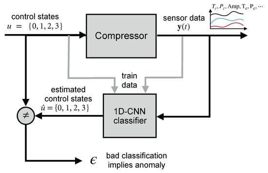 Finally, we demonstrate the use of our approach for detecting anomalies in the loading and unloading valves or solenoids. This can provide a huge help to the maintenance staff in order to identify a problem that worsens the compressor efficiency and hinders fitting the cooling load. In on monitoring, the proposed 1D CNN classifier predicts the control state based on fusing sensor data from the compressor (L samples each), and then it is compared with the real control state. If both control states (real and predicted) are different, it indicates an anomaly, i.e., these consequences (sensor data) should not be caused by this control state.