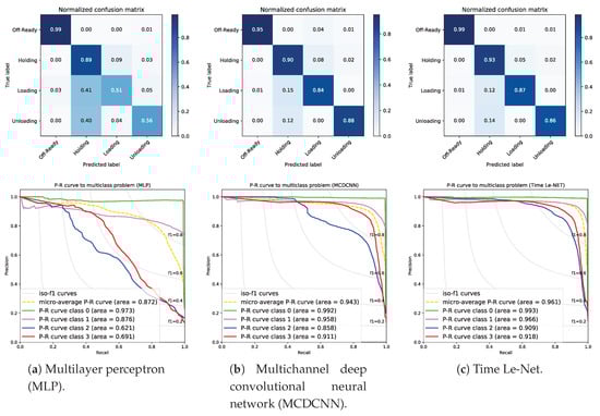 Additionally, we used the confusion matrices, which give an overall glance at the multi-classification problem, and prediction–recall curves (PR curves). Unlike the well-known receiver operating characteristic curves (ROC curves) (very popular for evaluating a classification problem), PR curves are not impacted by imbalanced datasets [35]. Other alternatives can be applied to deal with imbalanced data, such as the synthetic minority over-sampling technique (SMOTE) [36] or the k-Fold technique [37].