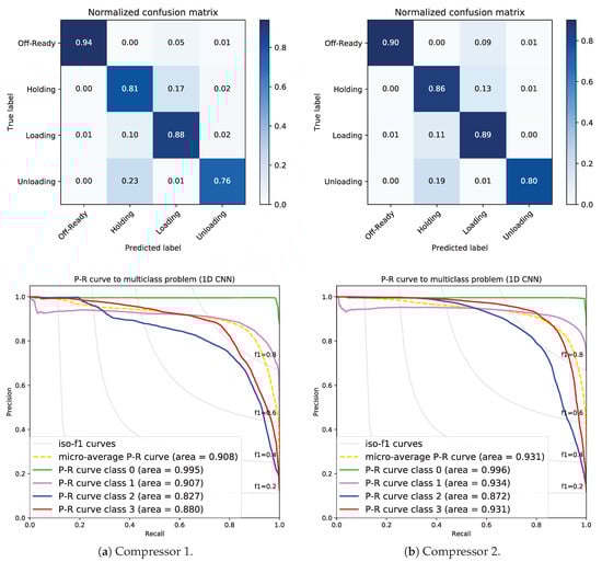 The performance of our approach using the test dataset from compressor 2 is slightly better than from compressor 1 (see Figure 8b). Nevertheless, 19% of class 3-Unloading is wrongly classified as 1-Holding.