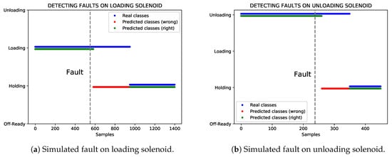 In Figure 9, we can see the results of the simulated data and make out the use of our approach for detecting faults. Figure 9a represents the detection of faults on the loading solenoid, whereas Figure 9b shows the detection of faults on the unloading solenoid. The dashed vertical line indicates when the fault occurs in both cases. Real control states (blue) and predicted control states using the 1D CNN model built with sensor data from compressor 3 are represented. The 1D CNN classifier correctly predicts the control states (green), except when the fault appears (red). Note that the classifier indicates faults with a short delay (normally min). This is due to the sliding window method. The larger the window is, the longer the delay will be. Occasionally, the classifier can wrongly predict some control states, but they do not remain in time.