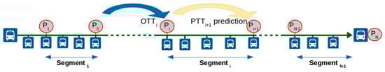 The term arrival time is the time at which the vehicle arrives at that stop. The arrival times observed at the points of interest on trip ec,t are represented by OPTc,t. If Lc has N points of interest, then the arrival times of each entity OPTc,t are recorded as an array of N integer values. The set comprising the arrival times on all trips on a route completed by Lc in a time period T is represented by OPTc,T. The prediction made by the proposed model consists of estimating the time that elapses between the vehicle reaching point of interest i and point of interest i + 1. Therefore, the DT at point of interest i is included in this time.