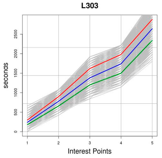 An example of clustering using the k-medoids technique is shown in Figure 3. On the horizontal axis the points of interest are represented and on the vertical axis the observed TT, measured in seconds, at the points of interest of a route. Each grey curve represents the TT recorded for a trip, OPTc,t. The dataset OPTc,T is formed by all the OPTc,t curves. The red, blue and green curves represent the medoids, which are the representative object of each of the three resulting clusters.