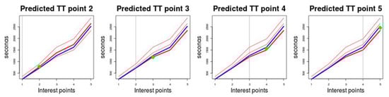 The prediction method is illustrated graphically in Figure 4. This illustrates the prediction for a route on which five points of interest have been defined and that are represented on the horizontal axis. The TT measured in seconds is represented on the vertical axis. The historical behaviour is represented by three medoids that have been drawn in red. The blue graph represents the TT of the test trip for which the prediction is being made and the green dot is the TT value predicted for the different points of interest. Table 3 illustrates the prediction method numerically with an example prediction of a trip. The route in this example has five points of interest, columns P1, P2, P3, P4 and P5. The historical TT behaviour is represented by three medoids, rows M1, M2 and M3. The observed TT up to each of the points of interest is displayed in row TT. As the vehicle reaches each point of interest, the medoid with the behaviour that is most similar to the TT observed on the trip is selected, using Manhattan distance as the similarity metric. Rows D(TT,M1), D(TT,M2) and D(TT,M3) contain the values resulting from calculating this distance between TT and M1, M2 y M3, respectively. At point of interest P1, we calculated the distance between the TT observed at this point, which was 180, and the values of the medoids at this point, which were 360 for M1, 240 for M2 and 240 for M3. The Manhattan distance values obtained were 180 for D(TT,M1), 60 for D(TT,M2) and 60 for D(TT,M3). Since the minimum distance value obtained was 60 and it was obtained with two medoids, M2 and M3, the first medoid that produced this minimum value, in this case M2, was selected for this method. The predicted TT values at each point Pi are displayed in row PTT. The TT prediction to reach point of interest P2 will be made taking medoid M2 as the historical reference and the prediction will be calculated, according to Equation (5), by adding to the TT observed at P1, which is 180 s, the difference between the TT value of M2 at point P2, which is 780 s, and the value of M2 at point P1, which is 240 s. Therefore, the value of the TT prediction to reach P2 is 720 s. The TT prediction to reach point P3 would be carried out analogously to this, but in this case the TT profile on the trip will consist of two values (180,720) and the historical TT behaviour profiles will be (360,900) according to M1, (240,780) according to M2 and (240,720) according to M3. At this point the historical profile that is most similar to the profile observed on the trip is that represented by medoid M3. As shown in Table 3, at the rest of the points of interest, M3 is the medoid with a profile most similar to the observed TT values and therefore its TT values will be those used to make the predictions at the other points.