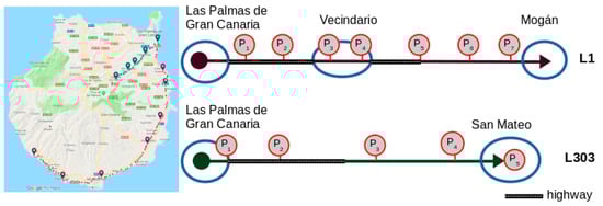 The datasets used came from the operational records of two lines operated by the intercity public transport network of the Island of Gran Canaria. The period of time analysed in the study was the whole of 2015. Therefore, according to the model, the value of T is the year 2015. These two lines, identified by codes L1 and L303, cover two important transport corridors on the Island. Line L1 covers the Capital-South corridor, starting in the city of Las Palmas de Gran Canaria, which, as the most populated urban nucleus where the main public service centres of the island are based, is the main transport generation point. The line goes through the main tourist centres—tourism is the largest sector of the island economy and generates the most employment. Line L303 covers the Capital-Centre corridor, starting in the city of Las Palmas de Gran Canaria and travelling through the largest population centres in the centre of the island. Table 4 shows the length and number of stops on these routes, and the number of stops selected for the study—the points of interest. In the case of line L1, of the 91 stops, 7 points of interest were selected. In the case of line L303, six were selected, giving rise to five route segments. Two aspects were taken into account when selecting stops as points of interest: the number of travellers and the distance between the stops (stops very close to each other were ruled out). The routes taken by the two lines travel along different types of road (fast roads, rural roads and urban roads) and, due to the different motivations and type of user, moments of peak and off-peak demand vary. Figure 5 shows the routes of these lines. On the left side of the figure, the route is shown on a map of the island, where the dots marked on each route represent the stops, and the balloon markers the points of interest selected for the study. On the right side, a schematic representation of the routes is displayed.