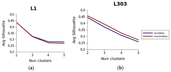 Behaviour of the silhouette function for each route depending on the number of clusters used in the clustering process. (a) Route L1; (b) Route L303.