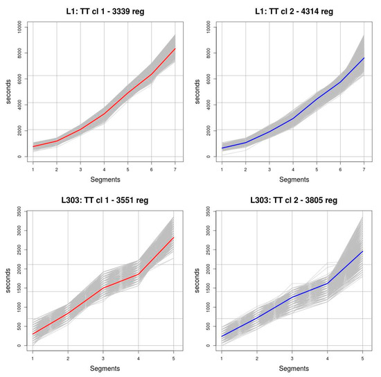 The first phase of the tests was designed to check how the distance metric and the number of clusters affected the process of creating the clusters. Two distance metrics were tested: the Euclidean and the Manhattan. These metrics were used to generate different segments in the OPT1,2015 and OPT303,2015 datasets, specifying different numbers of clusters beforehand, and evaluating the quality of the resulting segments with the silhouette function. Figure 6 shows the values returned by the silhouette function. The number of clusters used is represented on the horizontal axis and the resulting value of the function on the vertical axis. Based on the results obtained, we decided to use the Manhattan distance as the distance metric and to partition the data into two clusters. As can be seen, the behaviour of this function is very similar in the case of route L1. However, it may be observed in the case of route L303 that the function produces higher values, that is, higher levels of consistency in the clusters, when the Manhattan distance is used. Regarding the number of clusters, the best levels of consistency, regardless of the route analysed and the metric used, occur when two clusters are used. Indeed, both for route L1 and for route L303, the values of the silhouette function are very close to 0.45 using both the Euclidean metric and the Manhattan metric. It may also be observed that, irrespective of the route analysed and the distance metric used, as we increase the number of clusters used in the clustering process, the value of the silhouette function decreases, which means that the degree of consistency decreases. Figure 7 shows the result of grouping routes L1 and L303 using two clusters. The objects of the clusters are drawn in grey and the medoids of each cluster are drawn in red and blue. These medoids are the ones used in TT predictions that are displayed as results.
