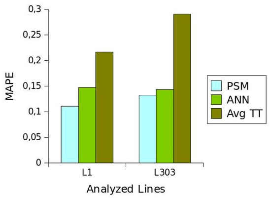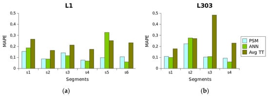 Figure 9 shows the average MAPE values obtained for each segment of each of the routes analysed. It can be seen that PSM performed the best since it provided a value close to 0.11 on L1 and 0.13 on L303. In the case of ANN, the average MAPE values obtained for the two routes were similar, and close to 0.14. The worst-performing method was clearly AvgTT with values of 0.21 and 0.29 for L1 and L303, respectively.