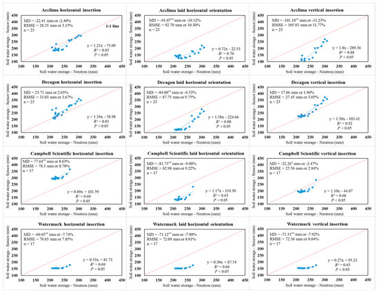 Sensor performance was assessed by comparing statistical parameters using two approaches: (1) Comparison between the average SWC of the sensor pairs and the NMM measurements at each installation depth (i.e., point comparisons), and (2) comparison of water storage in the soil profile as determined by integration of soil water sensor values and the NMM measurements. Direct comparison between depth-specific sensor measurements and NMM readings is known to be problematic. Bell et al. [26] and Schwartz et al. [27] cautioned against making direct comparisons between depth-specific SWC readings from NMMs and collocated soil water sensor measurements due to the large differences in the sensing volume of the NMM (2.8–3.4 × 105 cm3) compared to that of most soil water sensors (<500 cm3). This difference in soil sensing volumes can result in significantly different SWC readings as relatively small inconsistencies in soil properties and conditions can be overstated by a small sensing volume, but lessened, or averaged out by a larger sensing volume. Therefore, point measurements from the soil sensor array were integrated to estimate the profile water storage for comparison with the corresponding NMM measurements.