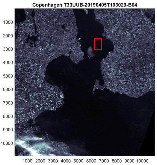 East part of Denmark in the red band B4 (m = 3) from 5 April 2019, 10:30 a.m. UTC. The red box is a ROI in the strait of Øresund surrounding Copenhagen airport.