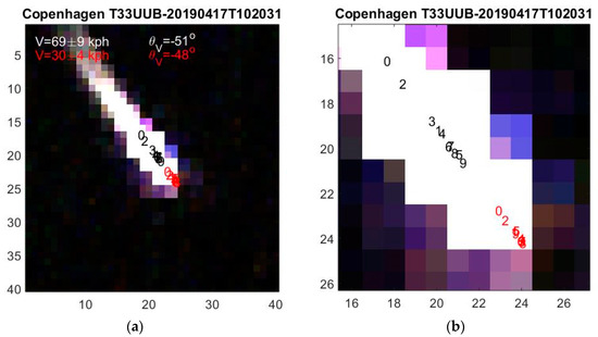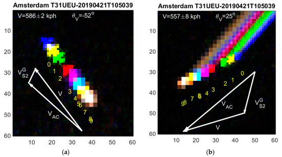 The satellite movement during the multispectral temporal delays causes a parallax effect (see Figure 3a) that moves objects at an altitude H northeast-wards in direction with respect to the ground. Stationary objects such as tall buildings, clouds, balloons, stalling aircrafts, etc. will be moved by an apparent velocity with respect to ground due to their parallax. Determining V from a linear regression of Equation (3), we find the object altitude