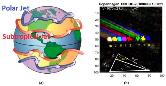 (a) Illustration of Earth’s meandering polar and subtropical jet streams. (b) An aircraft over Copenhagen where the contrails are affected by the polar jet stream (see text).