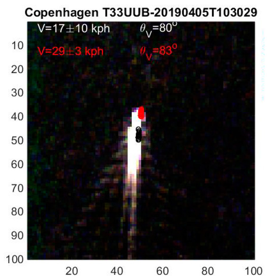 When ship wakes are short, they have less effect on the estimated central positions and both the central and the corrected positions of Equation (1) can be used for determining the ship velocity. An example is shown in Figure 6 where and are plotted with black and red numbers, respectively. Both are temporally ordered correctly and yield the ship velocity kph. According to AIS, a ship at that time and position is sailing at a speed of 15 kph in the same direction.