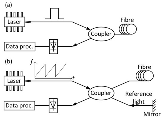 DCS, as a distributed fibre sensing (DFS) technique [21], is capable of employing the entire optical fibre as the sensing element and of providing measurements with a high degree of spatial density. The spatial information is usually resolved through optical time domain reflectometry (OTDR) or optical frequency domain reflectometry (OFDR). In an OTDR system, an optical pulse is launched into the fibre, and the backscattered light intensity is measured as a function of time [22], as shown in Figure 1a. The distance along the fibre to which a given backscatter component corresponds is determined by time-of-flight considerations, and the spatial resolution is commonly defined as half of the pulse length [22]. In OFDR, either the optical frequency of the light source or the frequency of an amplitude modulation is swept, for “coherent” and “incoherent” systems, respectively. The backscattered light as a function of frequency is acquired by heterodyne detection in either the optical (coherent OFDR) or electrical (incoherent OFDR) domains. The spatial information is retrieved by applying a Fourier transform to the backscatter in the frequency domain [23]. A classical coherent OFDR scheme is plotted in Figure 1b; the incident light with linearly scanning optical frequency is split by a coupler, whereby one part of the light is launched into the fibre and the other part acts as reference light. The backscattered light from the fibre is mixed with the reference light reflected by the mirror; then, their frequency beating is acquired by a photodetector. Finally, the obtained signal is processed to retrieve the spatial information.