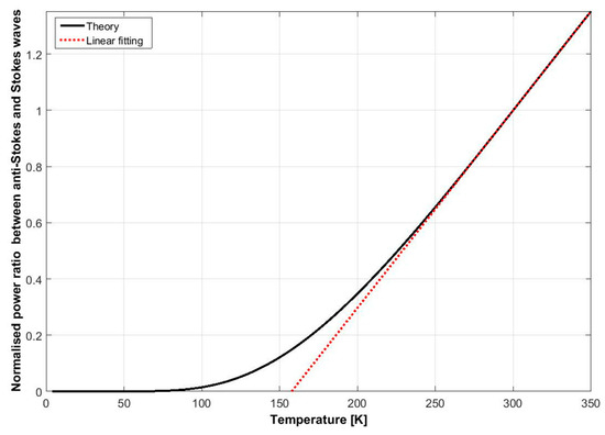 where is the Planck constant, is the optical frequency shift, is the Boltzmann constant, and is the absolute temperature. On the other hand, the amplitude of the Stokes part is proportional to . Hence, Raman distributed fibre sensors can retrieve the temperature profile along the fibre based on the optical power change of the anti-Stokes component [29]. In practice, both Stokes and anti-Stokes components are usually collected and compared in order to make the measurement more robust. The ratio of the optical power between the two components is calculated and depicted as a function of temperature in Figure 3. Obviously, the ratio changes quasi-linearly with the temperature from ~200 K to 350 K. The slope represents the temperature sensitivity, which is about 0.7%/K at 300 K. However, the sensitivity vanishes quickly below 200 K because the strength of spontaneous Raman scattering is temperature-dependent as shown by Equation (1). It has to be noted that Raman sensors are sensitive only to temperature, not strain.