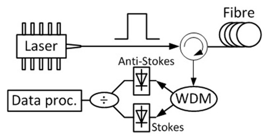 A simple sensing scheme based on Raman scattering is plotted in Figure 4. An intense optical pulse is launched into the sensing fibre; then, the Stokes and anti-Stokes components of the Raman scattering are selected by a wavelength division multiplexer (WDM) and acquired by photodetectors. The ratio between the obtained signal is used to retrieve the temperate profile. Additional data processing is necessary for calibration.