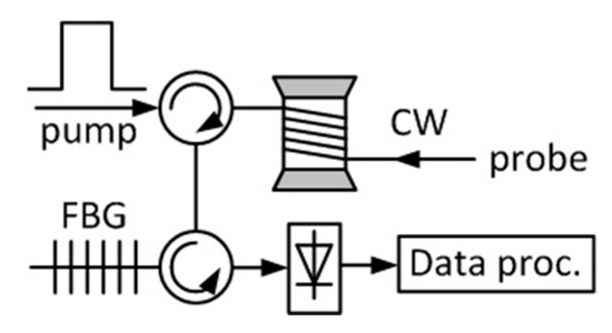 The amplitude of Brillouin scattered light is also temperature- and strain-dependent. In addition, the Brillouin frequency shift is proportional to the acoustic velocity in the medium, which is dependent on environmental conditions. Therefore, the resultant shift demonstrates a linear relationship with temperature and strain changes. Since the frequency-based measurement is inherently more robust and more stable than the intensity-based one, most current Brillouin distributed sensors measure the local Brillouin frequency to determine the environmental conditions for a better performance [30]. The basic set-up of a classical Brillouin sensor, a Brillouin optical time domain analyser, is depicted in Figure 5. An optical pulse (pump) and a probe which is a continuous wave (CW) are counter-propagating along the sensing fibre. Their optical frequency difference is scanned around the Brillouin frequency shift. At the receiver, a narrow band filter, usually an FBG, is used to select the probe and filter out the Rayleigh backscattering of the pump. The obtained Brillouin spectrum needs to be processed to find the location of the peak in order to determine the Brillouin frequency. The most popular used post-processing methods are polynomial/Lorentzian curve fitting, Lorentzian cross-correlation, and cross-reference plot analysis [31]. The Brillouin frequency, which is actually the location of the peak, is then determined with some data processing methods. The distributed Brillouin sensor is sensitive to both temperature and strain with typical sensitivities of ~1 MHz/K and 0.05 MHz/με, respectively.