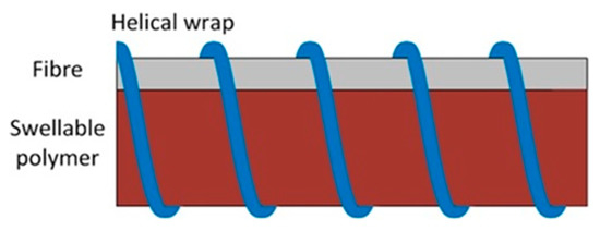 An example of a bending loss DCS sensor is shown in Figure 6, and consists of three parts: a swellable material, an optical fibre, and a helical wrap that ensures close contact between the fibre and the material. The sensitive material absorbs the analyte and expands in volume. Hence, the fibre is forced against the wrap and deformed, resulting in local bending loss which can be easily detected. To enhance the micro-bending loss, the helix period is designed as