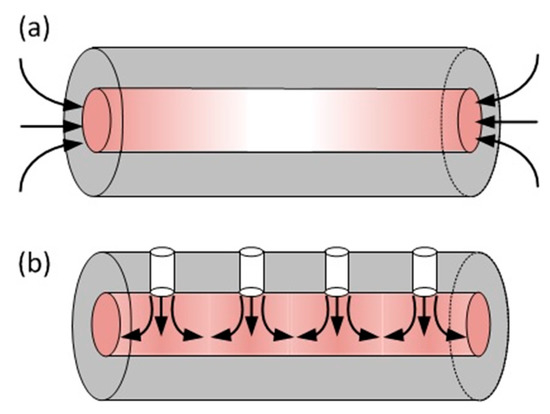Comparison of two distributed chemical sensing schemes based on hollow-core fibres. (a) The analyte enters the air hole through the fibre ends; (b) the analyte enters the air hole through conduits along the fibre. The tint represents the concentration of the analyte.