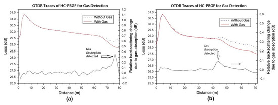 Distributed measurement of 10% acetylene based on a hollow-core fibre. (a) The gas was filled at the end of the fibre; (b) the gas was filled at 44 m of the fibre. The upper lines represent the measured OTDR traces, and the lower curves show the slope difference between the red line and dotted line. Reproduced with permission from Reference [52].