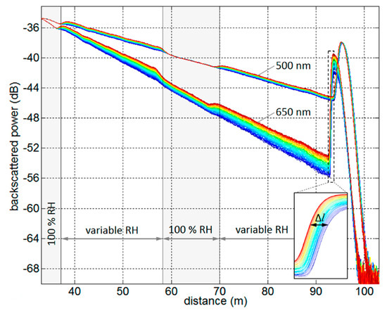 OTDR traces measured in a poly(methyl methacrylate) (PMMA) plastic optical fibre (POF) in a climate chamber with the relative humidity decreasing from 90% to 30% over five days. Reproduced with permission from Reference [55].