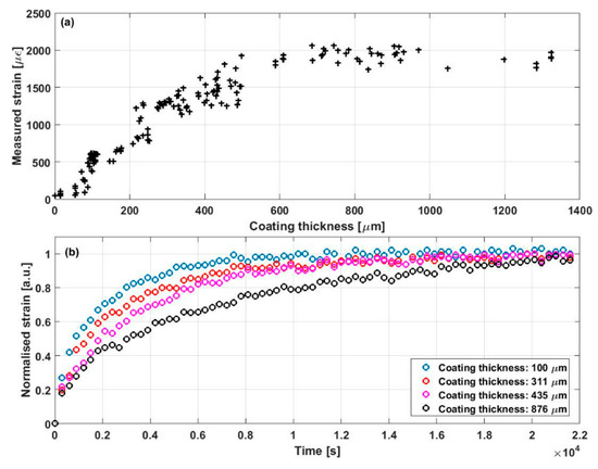 The sensitivity of such sensors is clearly dependent on the properties of the coating material, i.e., the expansion coefficient to the target analyte, the Young’s modulus, and the cross-sectional area [80]. Higher values of those parameters usually lead to an improved sensitivity. However, the increase of coating thickness results in a slower response of the sensor, simply because the analyte needs more time to diffuse in the coating. This kind of trade-off is demonstrated in Figure 14. The resultant strain is plotted in Figure 14a as a function of coating thickness under the same humidity change. Thicker coating leads to larger strain, but this impact becomes less significant as the thickness goes over 700 μm. On the other hand, Figure 14b shows the temporal evolution of humidity-induced strain measured by fibres with different coating thickness. The thicker coating (876 μm) clearly demonstrates a slower response. As a result, the coating needs to be carefully designed to find the balance between sensitivity and response time.