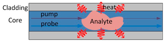 The absorption of optical radiation by molecules generates heat, causing variations of density, pressure, and refractive index. Gas sensing based on this idea is actually similar to the absorption-loss based measurement; pump light must be tuned to an absorption line for the analyte. Probe light at a wavelength far from an absorption feature is also necessary for reading out temperature changes triggered by the absorption. The whole process is simply illustrated in Figure 15. Garcia-Ruiz et al. gave an example of this technique being applied in a distributed way [84]. In that work, a gas sample present in the air holes of a small-core photonic crystal fibre absorbed the pump light through the evanescent field, and the small temperature increases were measured using coherent OTDR. Later, distributed gas sensing was realised in a hollow-core fibre where the gas absorption is larger. The local concentration of acetylene was retrieved by measuring the phase change experienced by the probe light due to the photothermal effect [85].