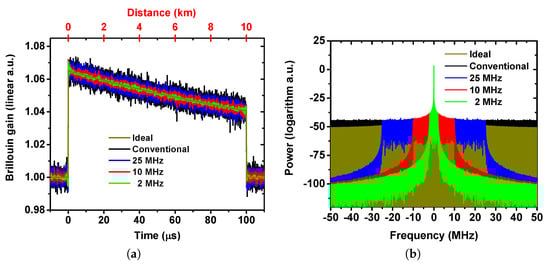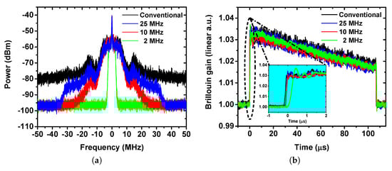 - Preussler, S.; Wiatrek, A.; Jamshidi, K.; Schneider, T. Brillouin scattering gain bandwidth reduction down to 3.4 MHz. Opt. Express 2011, 19, 8565–8570. [Google Scholar] [CrossRef]