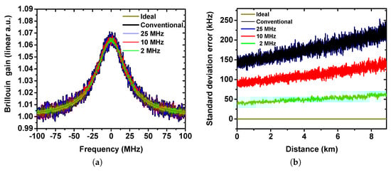 The measurement accuracy, which plays a vital role in the evaluation of sensor performance, symbolizes the uncertainty of the measurand (temperature or strain). It is characterized by the BFS estimation error in a BOTDA system and highly dependent on the probe SNR. As the reconstructed BGSs in Figure 2a depicts, the BGS with a lower bandwidth filter is clearer and makes the BFS estimation easier, which shows coherence to the time domain trace results in Figure 1a. If the noise is defined as the the root mean square (RMS) amplitude of the BGS in the frequency domain [], the noise level for the 2 MHz, 10 MHz and 25 MHz filter are 29.8%, 64.1% and 99.8% compared to the conventional case. Since the pulse width in the simulation is 100 ns and hence its BGS is more Lorentzian-like [], the BFS along the fiber is reconstructed by a Lorentzian fitting of the measured BGS. In the simulation, the standard deviation is calculated from a set of 200 BFS measurements at each fiber segment. Figure 2b illustrates the standard deviation error. The ideal trace, which is considered without any noise, has a zero standard deviation error, while the curve with too large bandwidth (with noise but without applying proper low pass filtering) has the highest standard deviation error. Note that the conventional error curve and the curve after applying the 25 MHz filter are well overlapped, since the 25 MHz filter allows still higher noise frequency components and thus lower SNR. The standard deviation error is decreased when the cut-off frequency of the filter is reduced. The standard deviation error at the end of the fiber with 2 MHz filtering is about only 50 kHz compared to 210 kHz when a 25 MHz cut-off frequency is used. Since the pump power is reduced exponentially along the fiber due to the fiber losses, the standard deviation error is increased exponentially.
