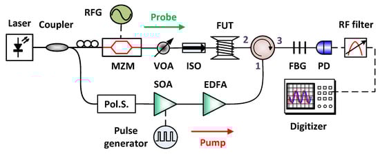 where is the SBS gain coefficient, is the pump power launched into the fiber, is the BFS and is the SBS gain bandwidth, which is usually in the range of 20 to 30 MHz in SSMF at 1550 nm pump wavelength and can be reduced by one order of magnitude with several methods for CW-SBS interactions [,,,]. The imaginary part of Equation (1) is the Brillouin phase spectrum and the real part represents the BGS which is approximated by a Lorentzian shape []. Provided that the pump depletion is negligible and the extinction ratio (ER) of the pump pulse is infinitely high so that no pump leakage-probe interaction is considered [,,], the local Brillouin gain that will be experienced by the probe wave at position z is given by