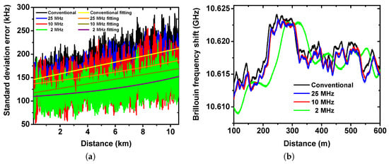 Next, the effect of the RF filtering on the BOTDA accuracy was evaluated. Figure 5a shows the evolution of the standard deviation error along the fiber. Due to the noise reduction and SNR enhancement, the impact of the RF filter can be clearly observed. The error is 208 kHz at 10 km distance with a 25 MHz filter, which corresponds to a measurand (temperature) resolution of 0.2 C, while it is reduced to 147 kHz (measurand resolution 0.15 C) with a 2 MHz filter. Meanwhile, applying 2 MHz filtering reduces the standard deviation error by 32% compared to the conventional case.