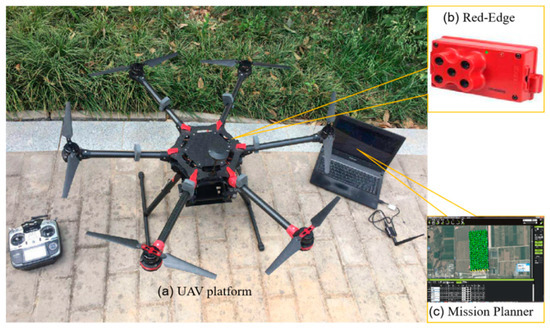 The main elements of the UAV multispectral remote sensing system. (a) UAV platform (b) RedEdge multispectral camera, and (c) the software, Mission Planner.
