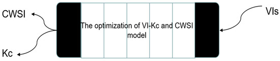 where ET0 is the reference evapotranspiration estimated by FAO Penman–Monteith method that uses data including altitude, latitude, maximum temperature, minimum temperature, mean temperature, average relative humidity, wind speed and sunshine hours. KC is a crop coefficient obtained by utilizing the VI-Kc model with optimal performance. The CWSI was also obtained from the relational model (VI-CWSI). The models are shown in Figure 3.