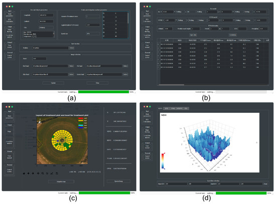 DSS-VRI software interface. (a) The basic parameter setting and data input interface. (b) CWSI, ETc and precipitation calculation interface. (c) The irrigation duty-cycle control map interactive interface. (d) The local data analysis interface.