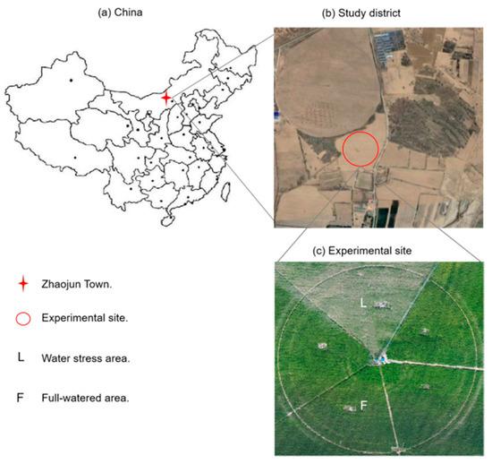 Experimental site description. (a) The location of study district. (b) The location of experimental site. (c) Division of treatment region, water stress area and full-watered area.