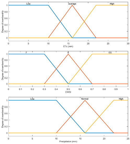 Triangular and ladder membership functions input to the fuzzy system. The linguistic variables are interpreted as follows: “Low” for less rainfall or evapotranspiration in the coming week, “Average and Normal” for normal rainfall and evapotranspiration in the coming week, and “High” for rainy or high evapotranspiration in the coming week. F for crop water sufficient in the current state, S for mild water stress, ES for the most severe stress. The horizontal scales of ETc, CWSI, and precipitation represent evapotranspiration (in mm) in the coming week, the water stress index, and the amount of precipitation (in mm) in the coming week, respectively.