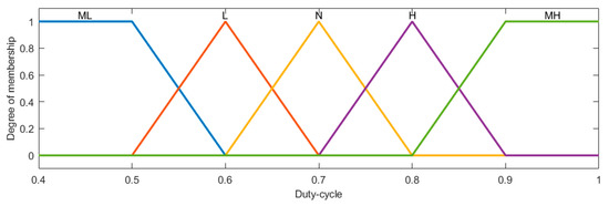 Member functions output from the fuzzy system to the stage of defuzzification. The outputs are built from five linguistic variables: very low (ML), low (L), normal (N), high (H), and very high (MH).