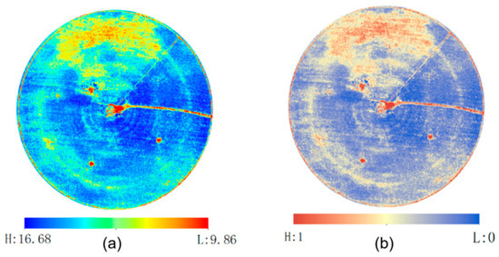 The ETc and CWSI maps. (a) ETc map. Blue represents a relatively higher ETc, and red lower; (b) CWSI map. Blue represents a relatively lower CWSI, and red higher.