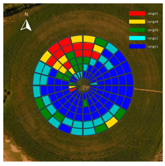 As shown in the ETc map of Figure 8a, blue represents a relatively higher ETc, and red lower. If a crop has insufficient water supply, stomata will close in order to limit water loss through transpiration [34], resulting in a decreased ETc. Also, the CWSI can be employed to evaluate water status in plants [35]. When the CWSI is 0, it indicates no water stress; while when the CWSI is 1, this indicates the most severe stress. According to the CWSI map of Figure 8b, blue represents a relatively lower CWSI, and red higher. In this study, the district of lower ETc and higher CWSI matches to water stress treatment regions, consistent with the expected results. After data acquisition and by using preinstalled fuzzy rules, the DSS-VRI fuzzy logic system generates solenoid valve duty-cycle for sub-region of different management. The lower ETc and higher CWSI exhibited in the water stress area (Figure 8), implies more water requirements. In this case, the pivot lateral was configured for six irrigation zone groups. Each irrigation zone was comprised of five sprinkler drop hoses that were hydraulically connected and actuated by a single electronic solenoid valve. The serial number of angle zone for the boundary points at 0°, 15°,..., 345°, and 360°. The distance from each group boundary to center point were 13–23 m, 23–32 m, 32–42 m, 42–51 m, 51–60 m and 60–70 m, respectively. The DSS-VRI combined boundary location information and created a control map with five reference duty-cycle values, as shown in Figure 9.