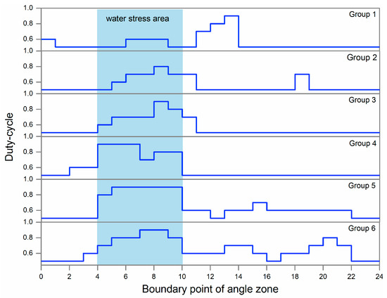 Figure 10 is the two-dimensional coordinate exhibition of the control map. Under the fixed moving rate of 20%, a higher duty-cycle implies the more irrigation amount, and a lower duty-cycle leads to less irrigation amount. As seen in the Figure, the water stress area was well divided and irrigated with more water. The amount of water application in all directions of Groups 2 to 6 was in line with model expectations. However, for Group 1 with a small radius, it was easy to be affected by adjacent areas’ irrigation, and its stress trait in Figure 10 is not obvious. In addition, its district is between 165°–210° is the working area of underground submersible pump, so the irrigation amount has an obvious fluctuation.