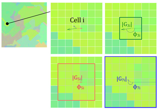 The modulus provides an indication of the amount of change of the spectrum in the direction given by angle, , for a window size of . To illustrate this, Figure 1 depicts an example of extracting the modulus and angle values for a cell from an RGB image. In this CA implementation, the values of the three moduli and angles, (), represent the information the CA collects from the neighborhood of a cell i in order to decide on the transition rule to apply.