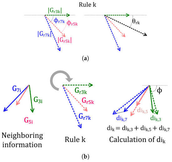 Notice that the encoding of the transition rules is a direct representation of three vector gradients. To make things clear, here subindex r is used to prevent confusions between rule parameters and the values of the gradient vectors that were extracted from the neighborhood information of a cell. Now, if we select a representation where these three vector gradients are independent of angle rotations and reflections, only five parameters are required to represent the three vector set. One of the angles, in this case, , will always be taken as equal to 0. Figure 2a (left) shows a geometrical representation of the condition parameters of a rule.